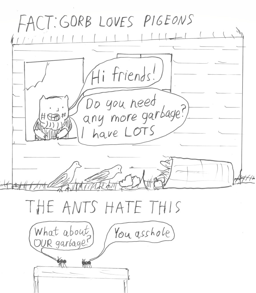 Just establishing that Gorb likes pigeons. Not that it’s important to any big overarching plans I have down the line