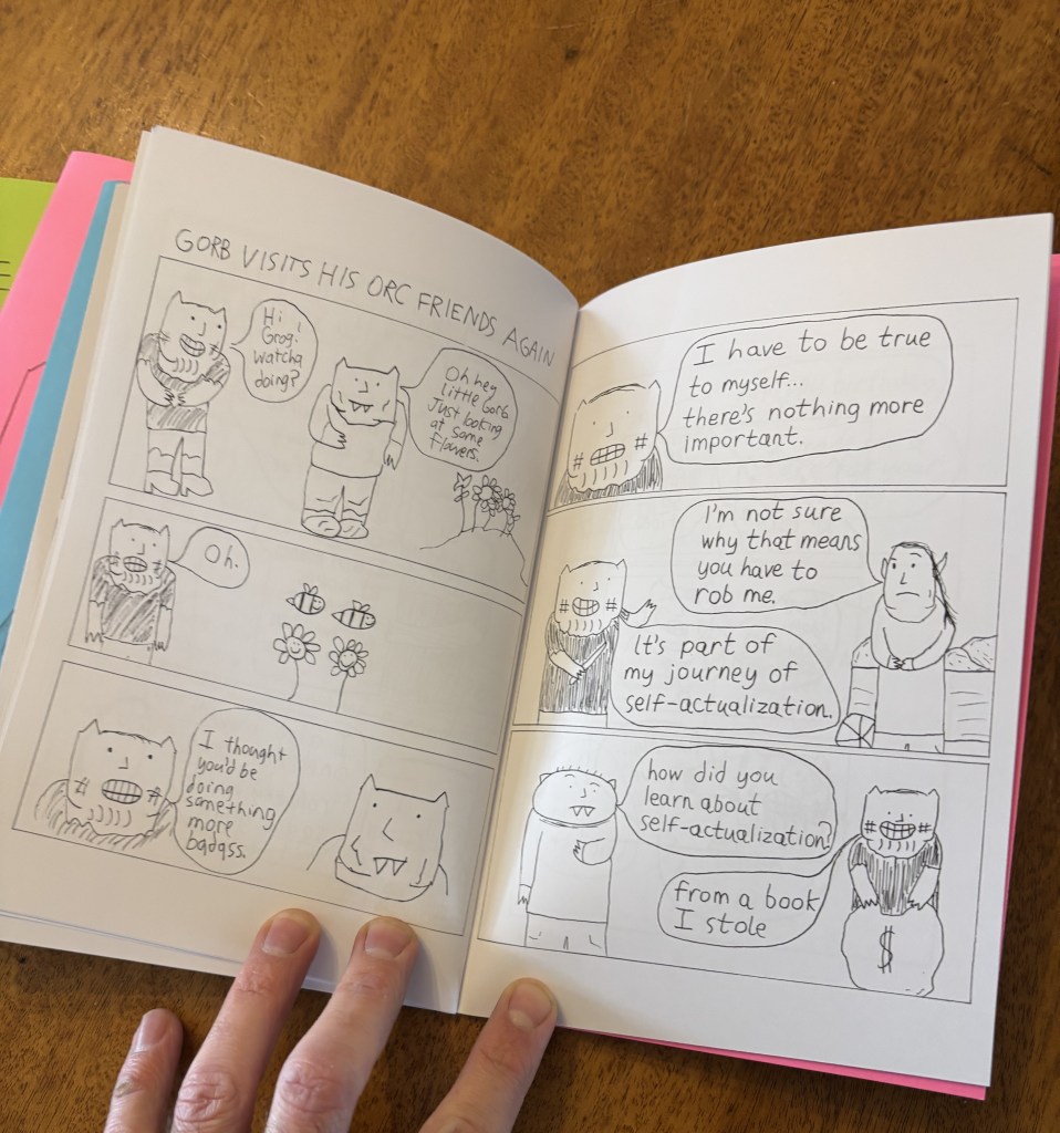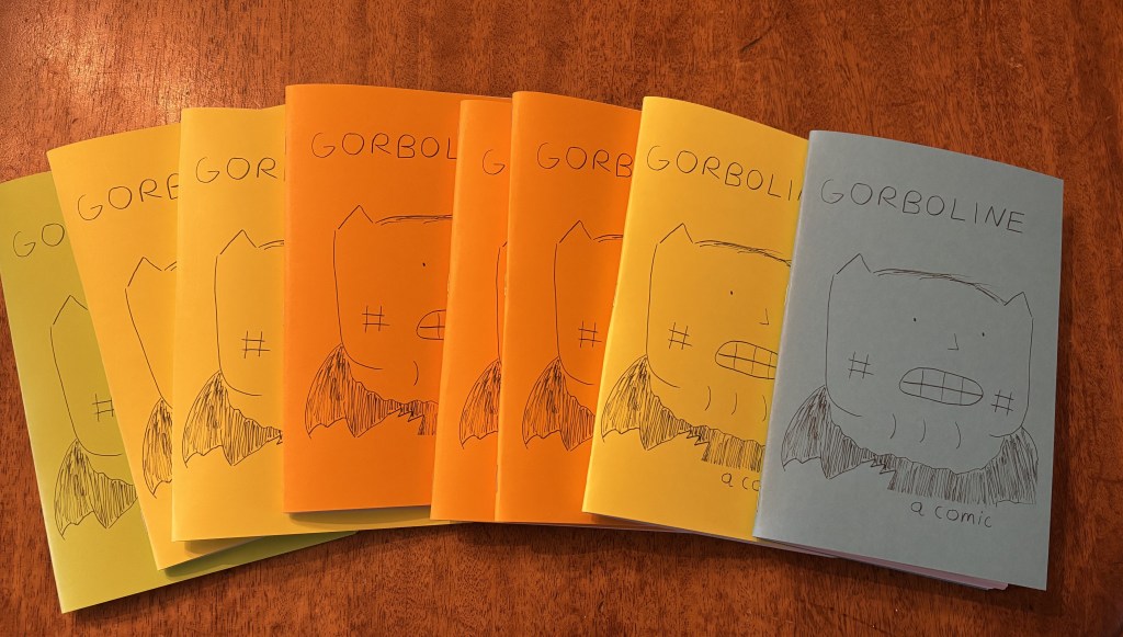 I’m excited to share that there is now a Gorboline zine! This cute lil’ guy contains 48 pages of my favorite Gorboline comics. There are two cover variations and it’s available in a variety of different colors. Each comic is handmade and stapled at home, including being printed on my dependable but now extremely overworked HP inkjet printer.